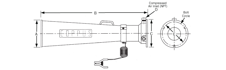 壓縮空氣或蒸氣透過單一入口接合裝置 進(jìn)入Jectair鼓風(fēng)機(jī)。由噴嘴噴出的氣體或蒸氣,形成文丘里原理,吸引周圍空氣經(jīng)由入口進(jìn)入Jectair,空氣便透過管狀擴(kuò)散管以高速率的方式被排放出來。